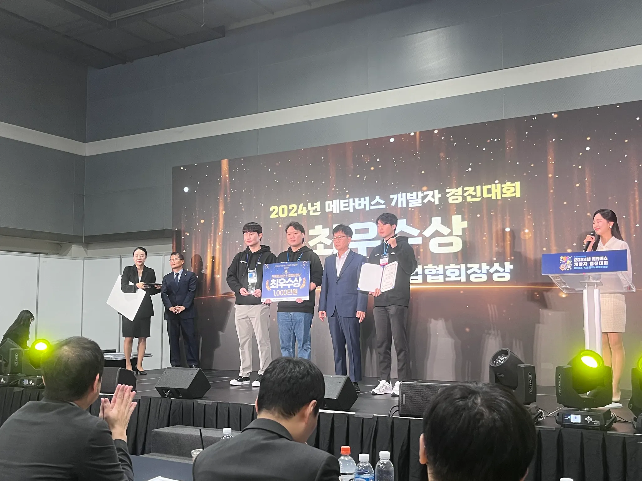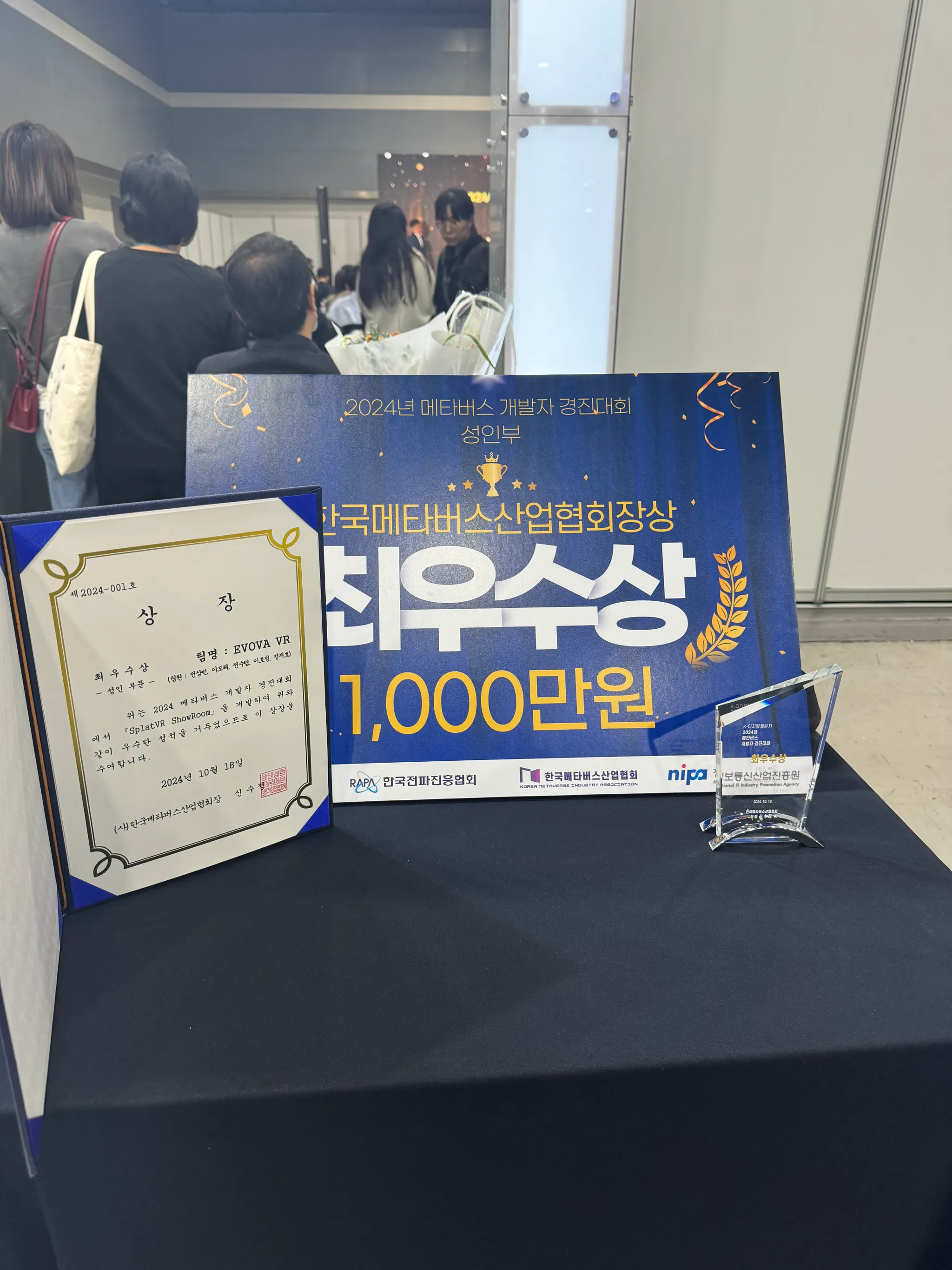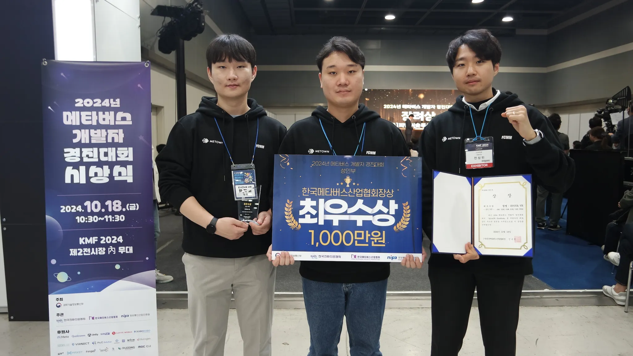 On October 18, 2024, the EVOVA VR team in CGnA won the grand prize at the “2024 Metaverse Developer Contest” hosted by the Ministry of Science and ICT and jointly organized by the Korea Radio Promotion Association, the Korea Metaverse Industry Association, and the Information and Communication Industry Promotion Agency.