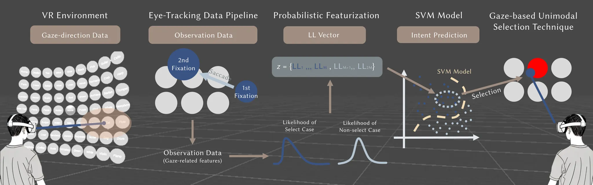 Eye gaze is regarded as a promising interaction modality in extended reality (XR) environments. However, to address the challenges posed by the Midas touch problem, the determination of selection intention frequently relies on the implementation of additional manual selection techniques, such as explicit gestures (e.g., controller/hand inputs or dwell), which are inherently limited in their functionality. We hereby present a machine learning (ML) model based on the Bayesian framework, which is employed to predict user selection intention in real-time, with the unique distinction that all data used for training and prediction are obtained from gaze data alone. The model utilizes a Bayesian approach to transform gaze data into selection probabilities, which are subsequently fed into an ML model to discern selection intentions. In Study 1, a high-performance model was constructed, enabling real-time inference using solely gaze data. This approach was found to enhance performance, thereby validating the efficacy of the proposed methodology. In Study 2, a user study was conducted to validate a manual-free technique based on the prediction model. The advantages of eliminating explicit gestures and potential applications were also discussed.